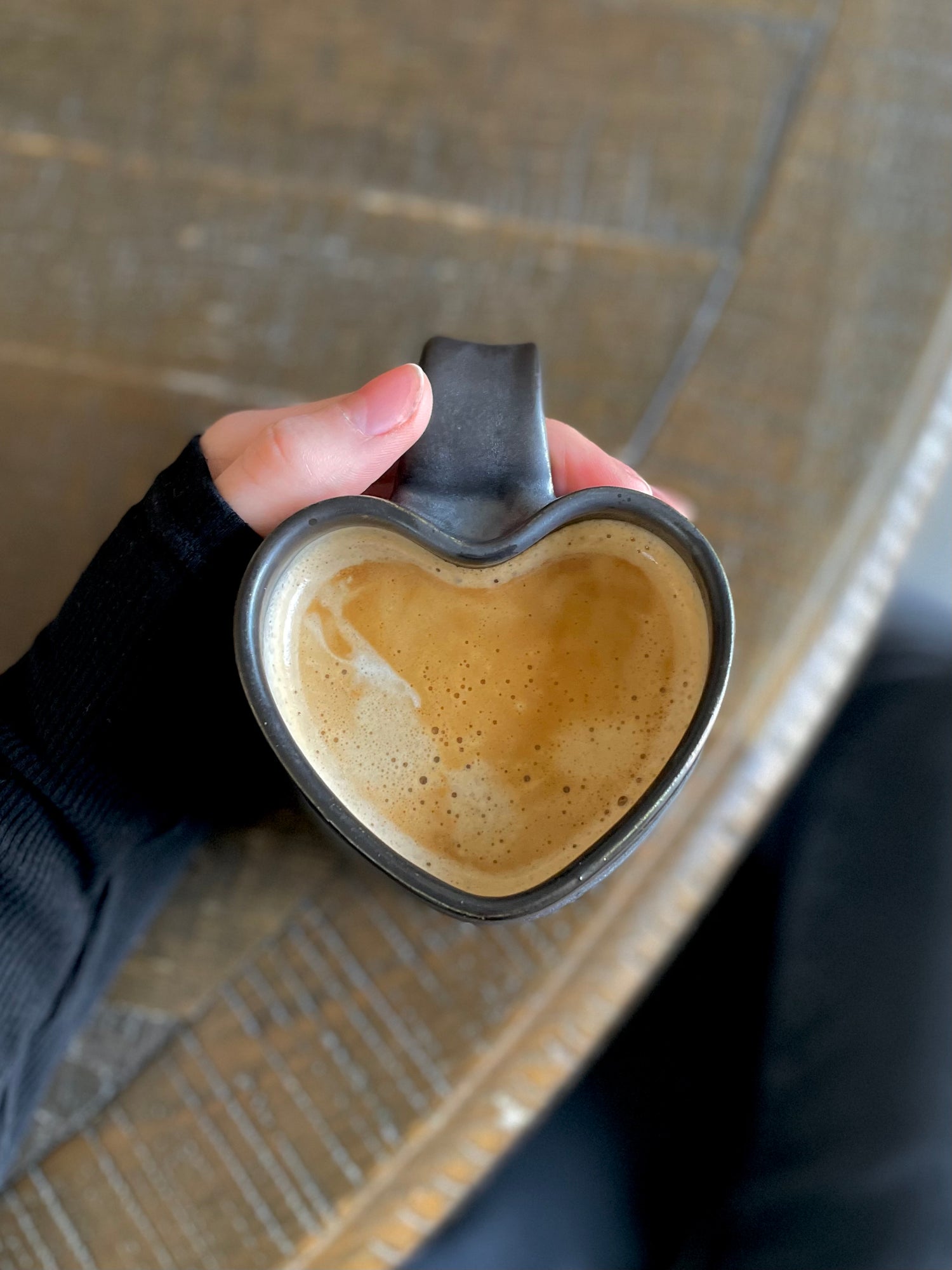 Each black heart mug is thrown on the wheel, trimmed, gets a pulled handle attached to it, then once dry is put in the kiln for its first firing where it gets to 1830 Fahrenheit. Each mug is then glazed and put in the kiln for another firing where it gets to 2230 Fahrenheit. After the final firing every mug gets sanded on the bottom to ensure a nice smooth surface and is then ready for its new home!
