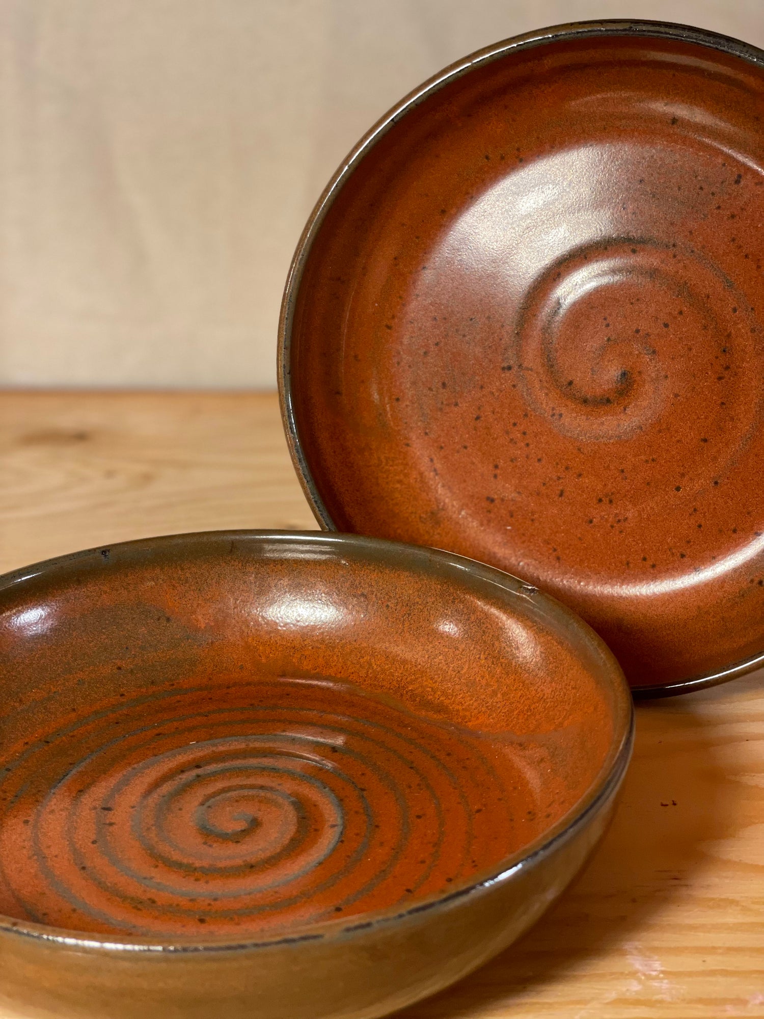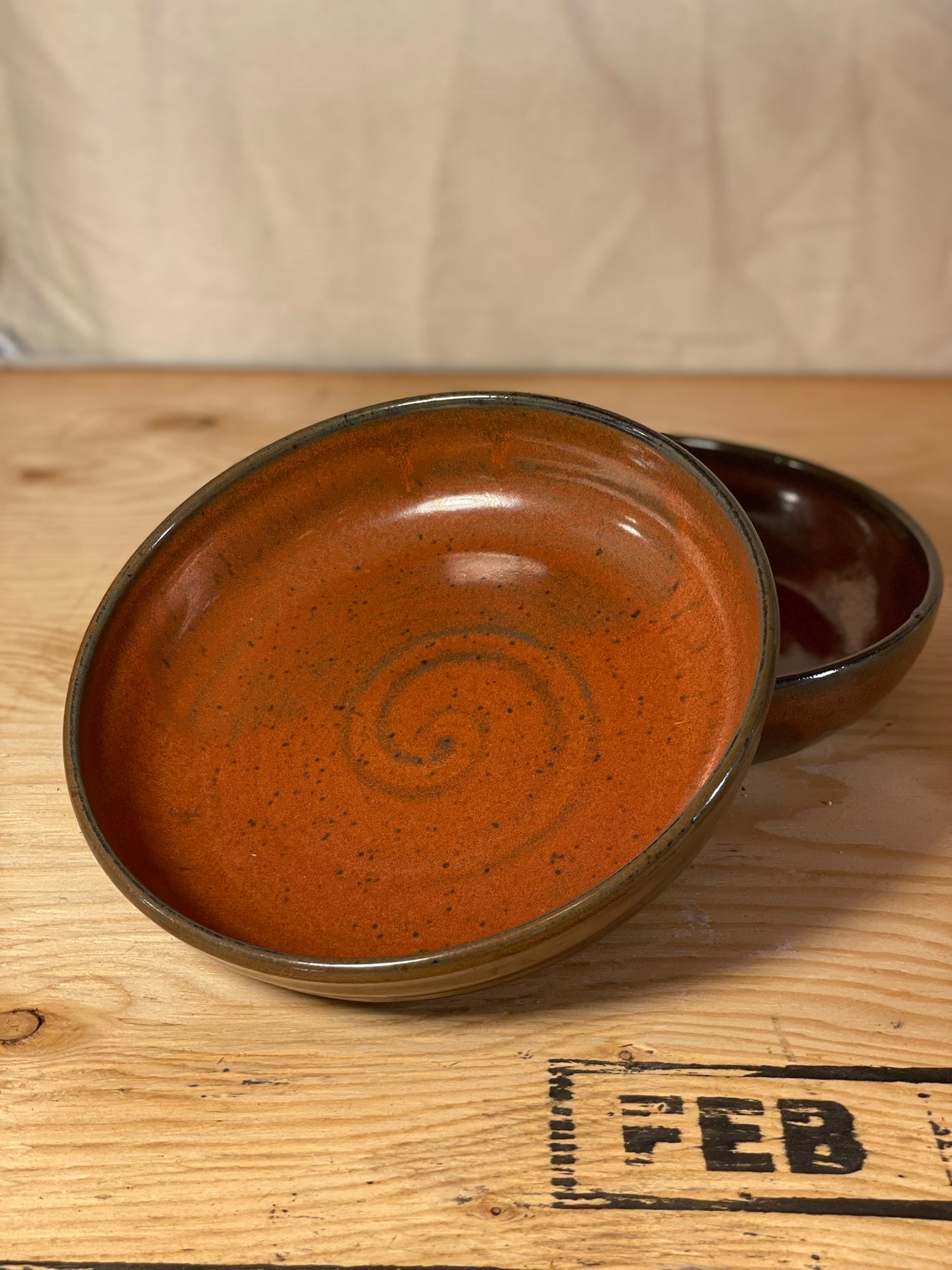 Each blate is thrown on the wheel, trimmed, then once dry is put in the kiln for its first firing where it gets to 1830 Fahrenheit. Then each blate is glazed and put in the kiln for another firing where it gets to 2200 Fahrenheit. After the final firing every blate gets sanded on the bottom to ensure a nice smooth surface and is then ready for its new home!