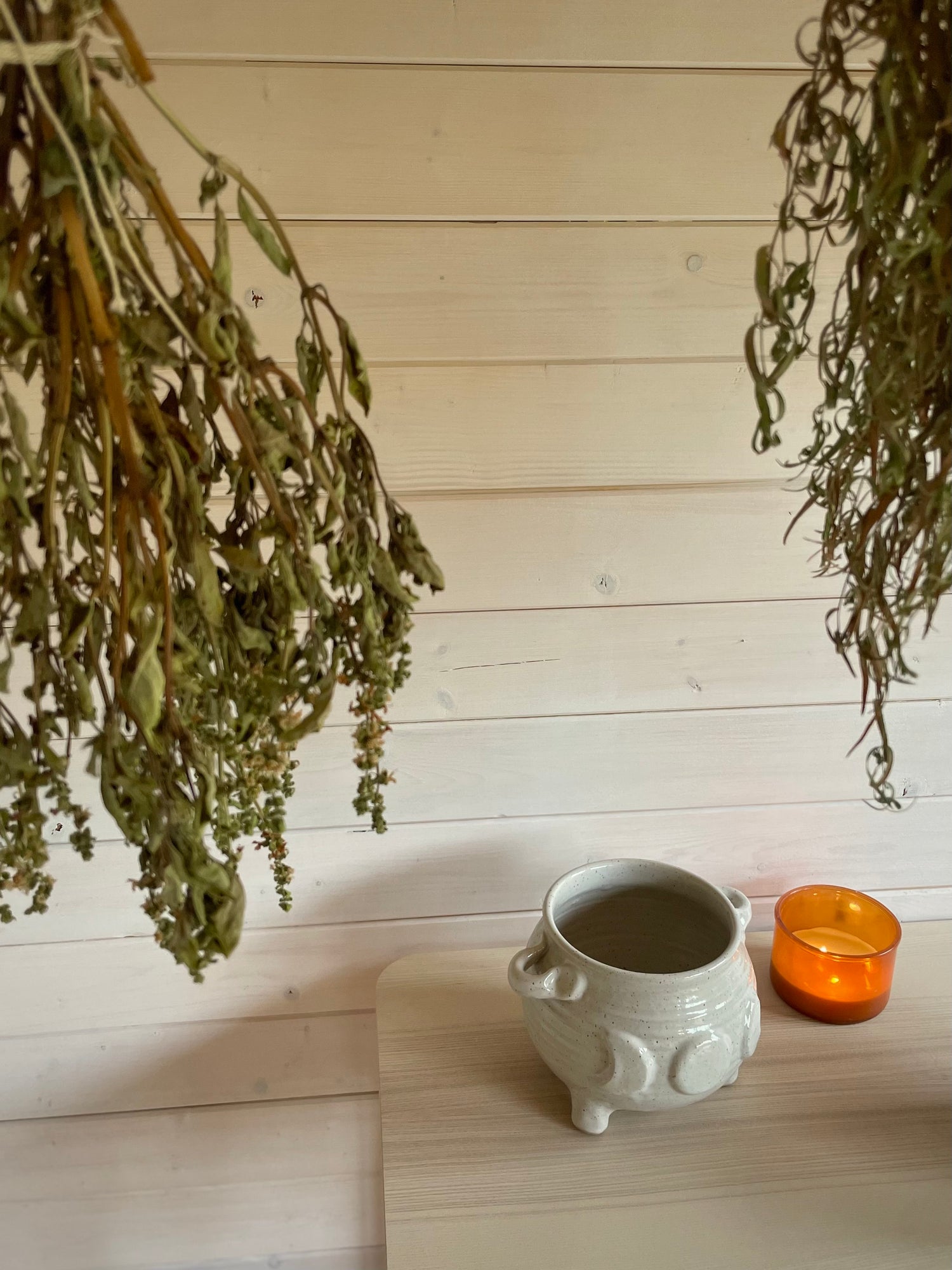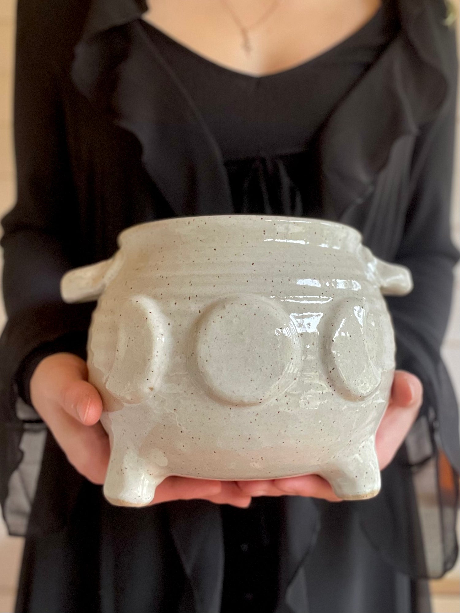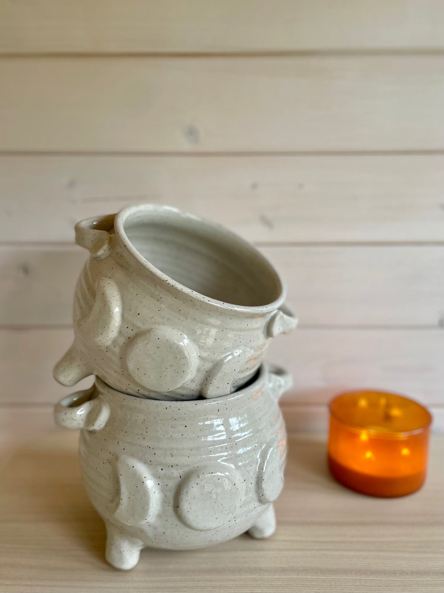 Lovingly designed and completely handmade in house by potter Emma Cranston. Each cauldron is thrown on the wheel, trimmed, then gets three feet, moons and little pulled handles attached to it. Once dry it is put in the kiln for its first firing where it gets to 1830 Fahrenheit. Once out of the kiln each mug is sanded and waxed on the bottom, then glazed and put back in the kiln for another firing where it gets to 2200 Fahrenheit.