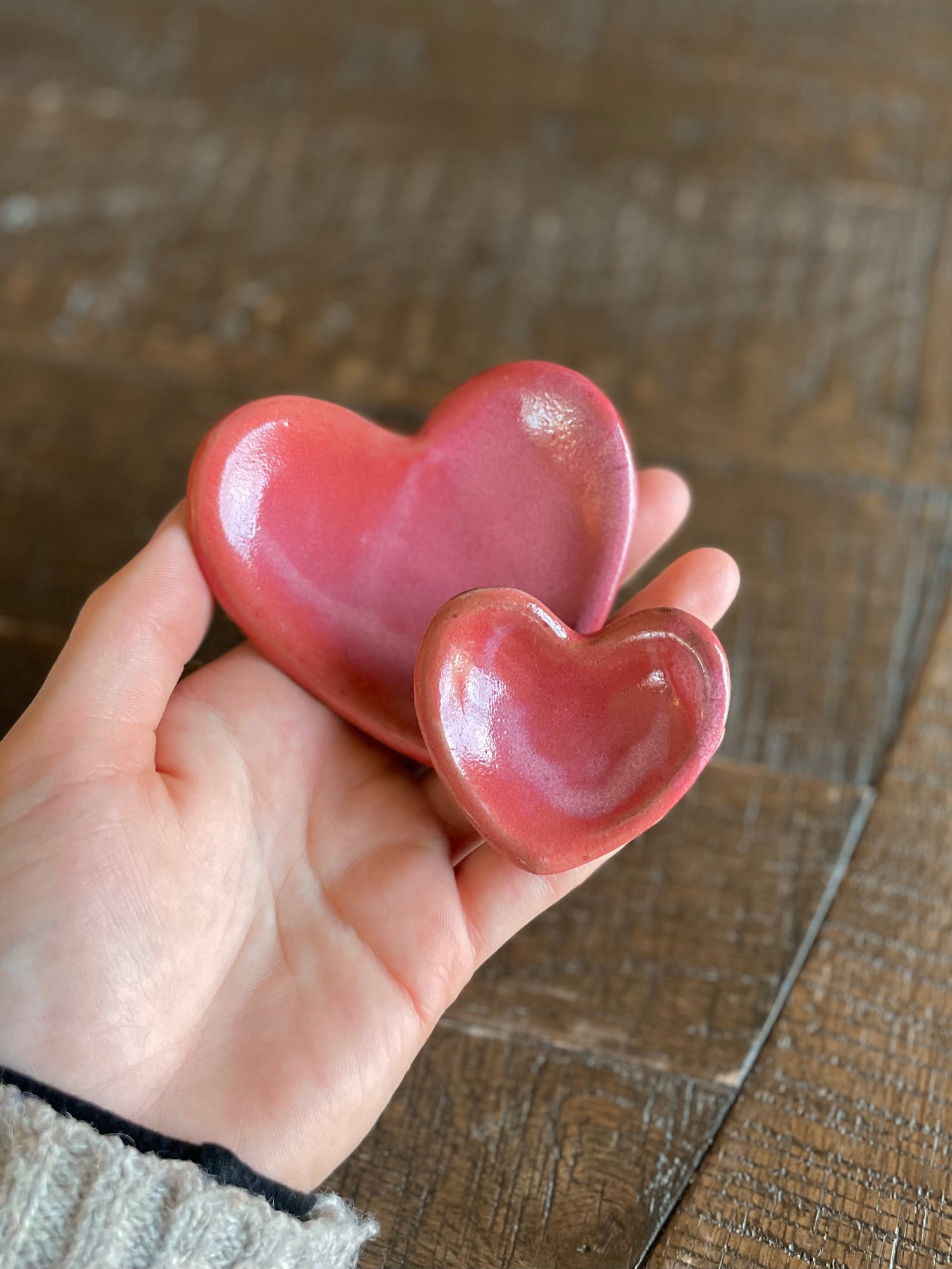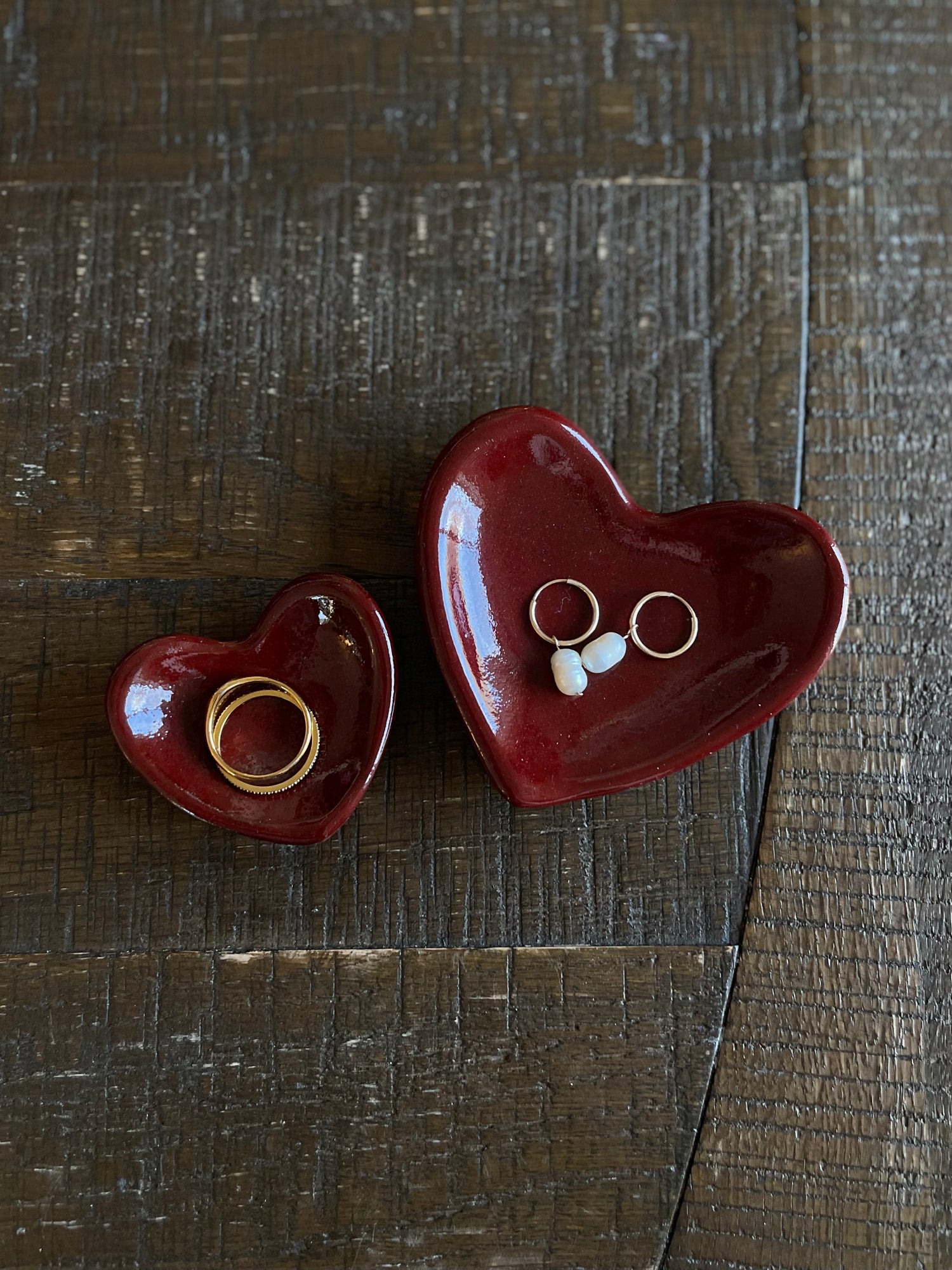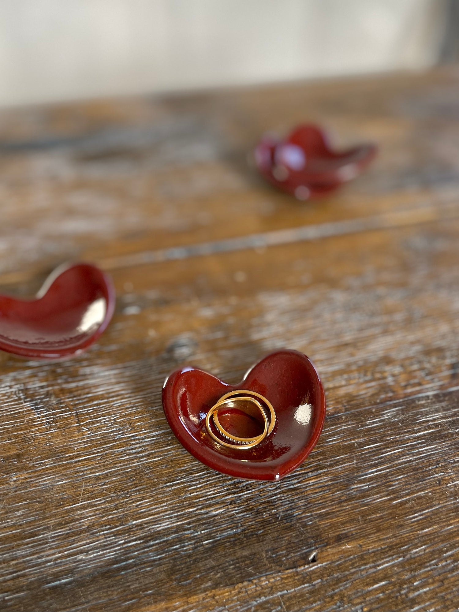 Each mini heart dish is slab rolled, cut out, and cleaned up around the edges. Then once dry is put in the kiln for its first firing where it gets to 1830 Fahrenheit. Each dish is then glazed and put in the kiln for another firing where it gets to 2230 Fahrenheit. After the final firing every dish gets sanded on the bottom to ensure a nice smooth surface and is then ready for its new home!