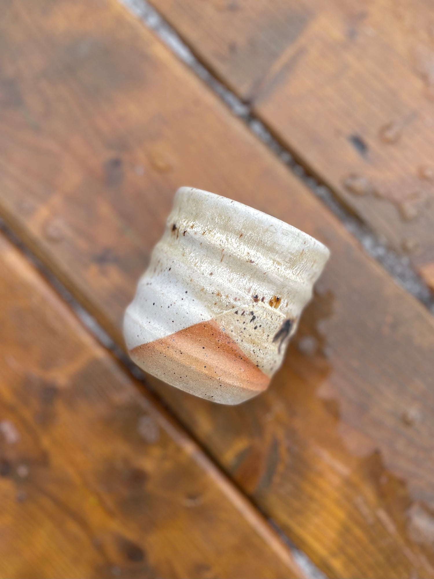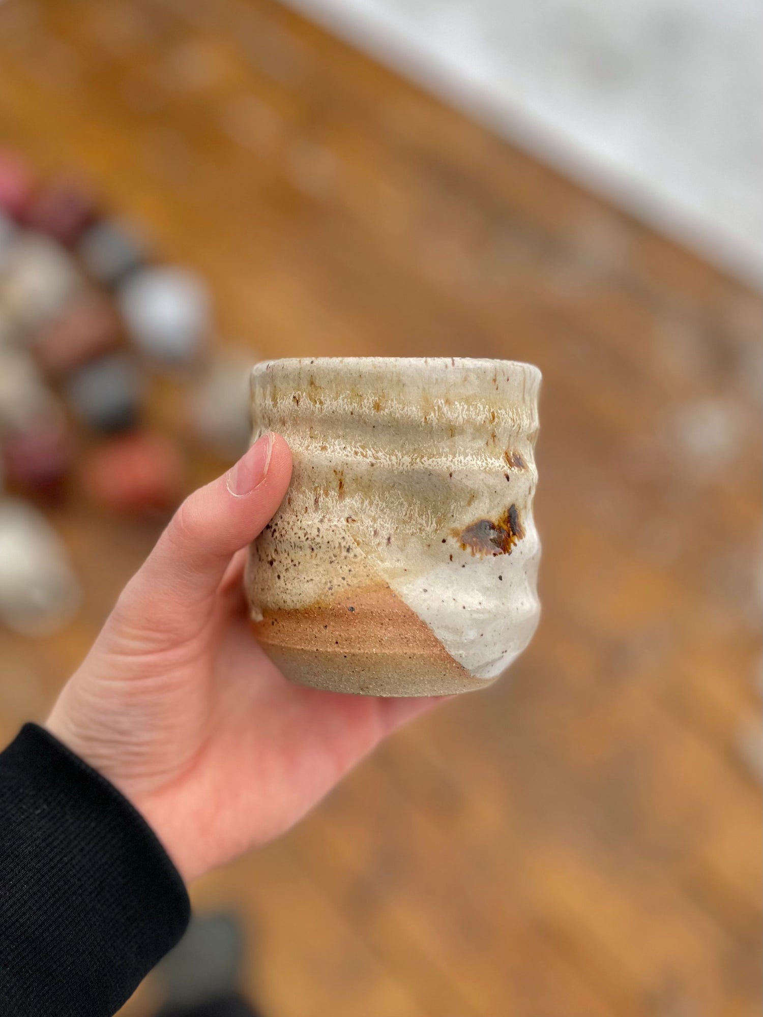 Each cup is thrown on the wheel, dimpled, trimmed, then once dry is put in the kiln for its first firing where it gets to 1830 Fahrenheit. Then each cup is waxed, glazed and put in the kiln for another firing where it gets to 2200 Fahrenheit. After the final firing every cup gets sanded on the bottom to ensure a nice smooth surface and is then ready for its new home!