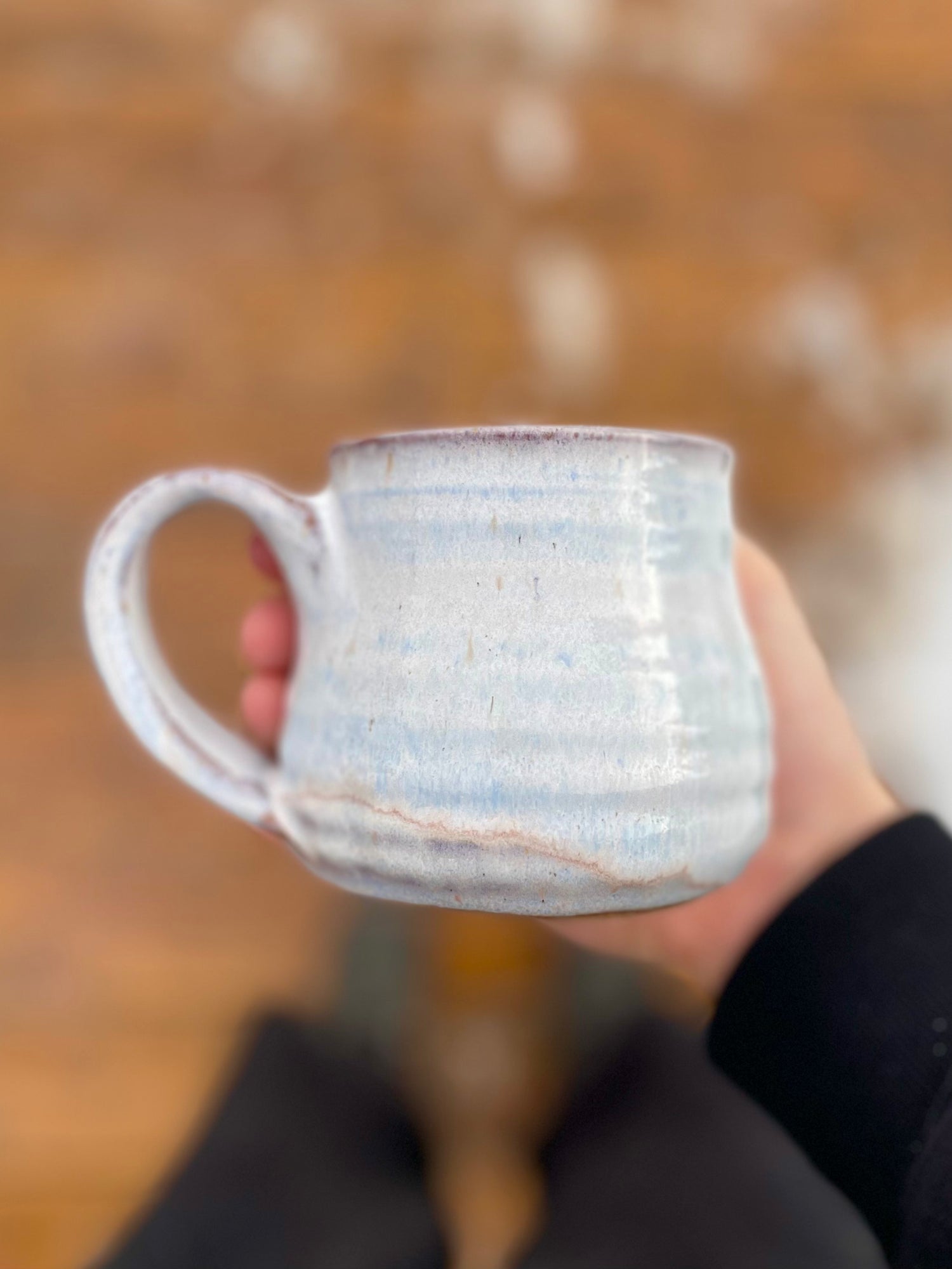 Each mug is thrown on the wheel, trimmed, gets a pulled handle attached to it, then once dry is put in the kiln for its first firing where it gets to 1830 Fahrenheit. Then each mug is waxed, glazed and put in the kiln for another firing where it gets to 2200 Fahrenheit. After the final firing every mug gets sanded on the bottom to ensure a nice smooth surface and is then ready for its new home!